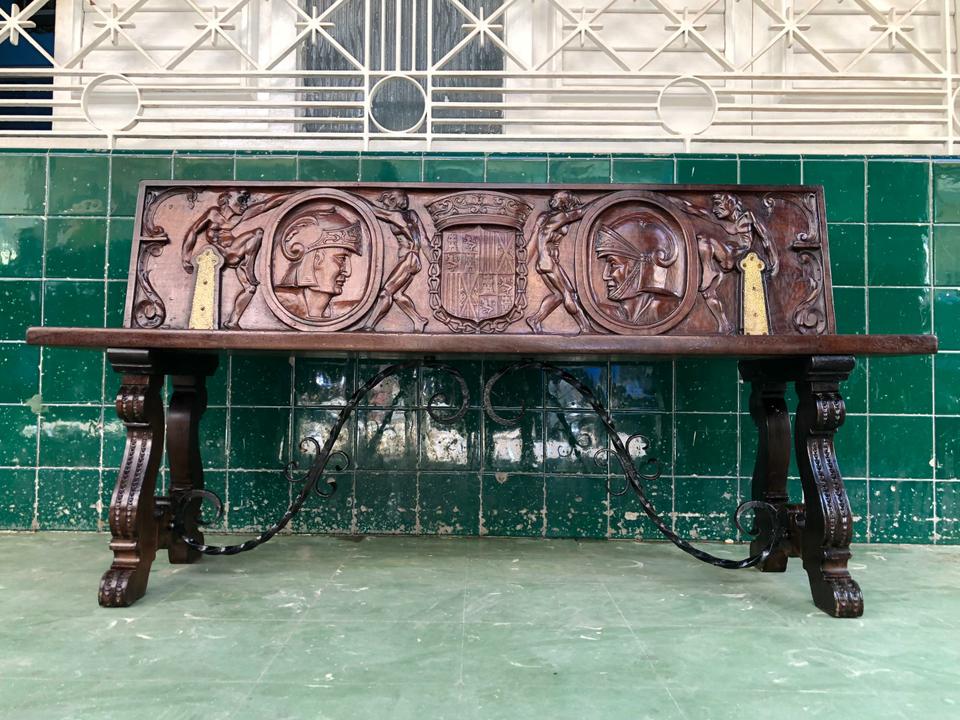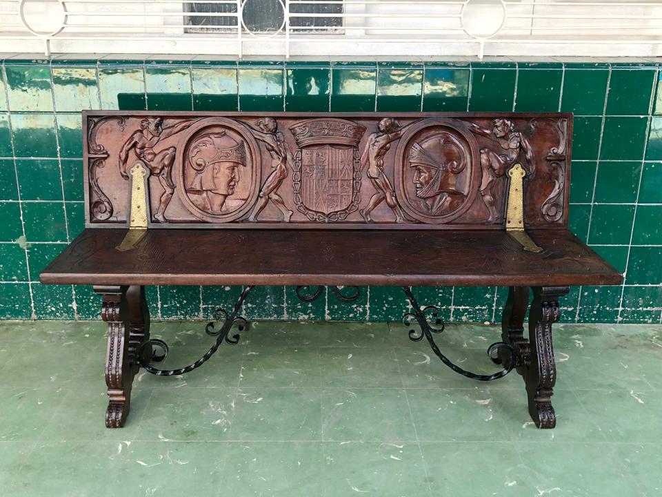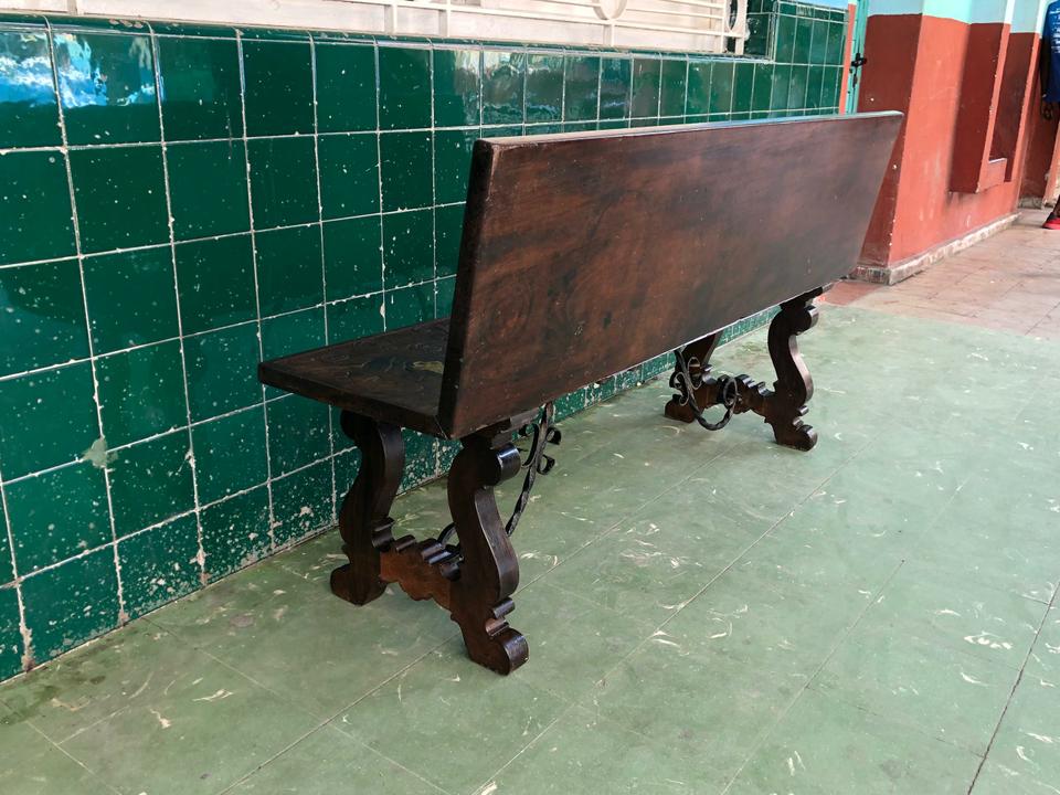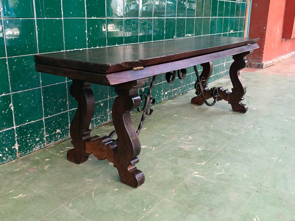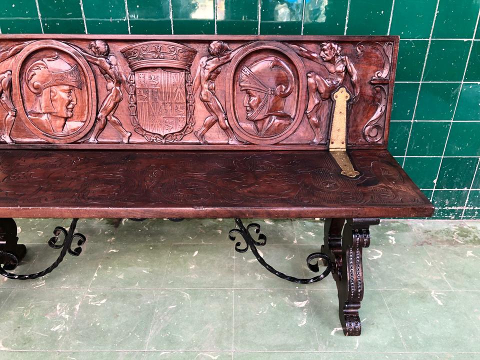 Banco estilo Renacimiento Italiano acabado de restaurar. Tiene dos bisagras que permite bajar el espaldar.